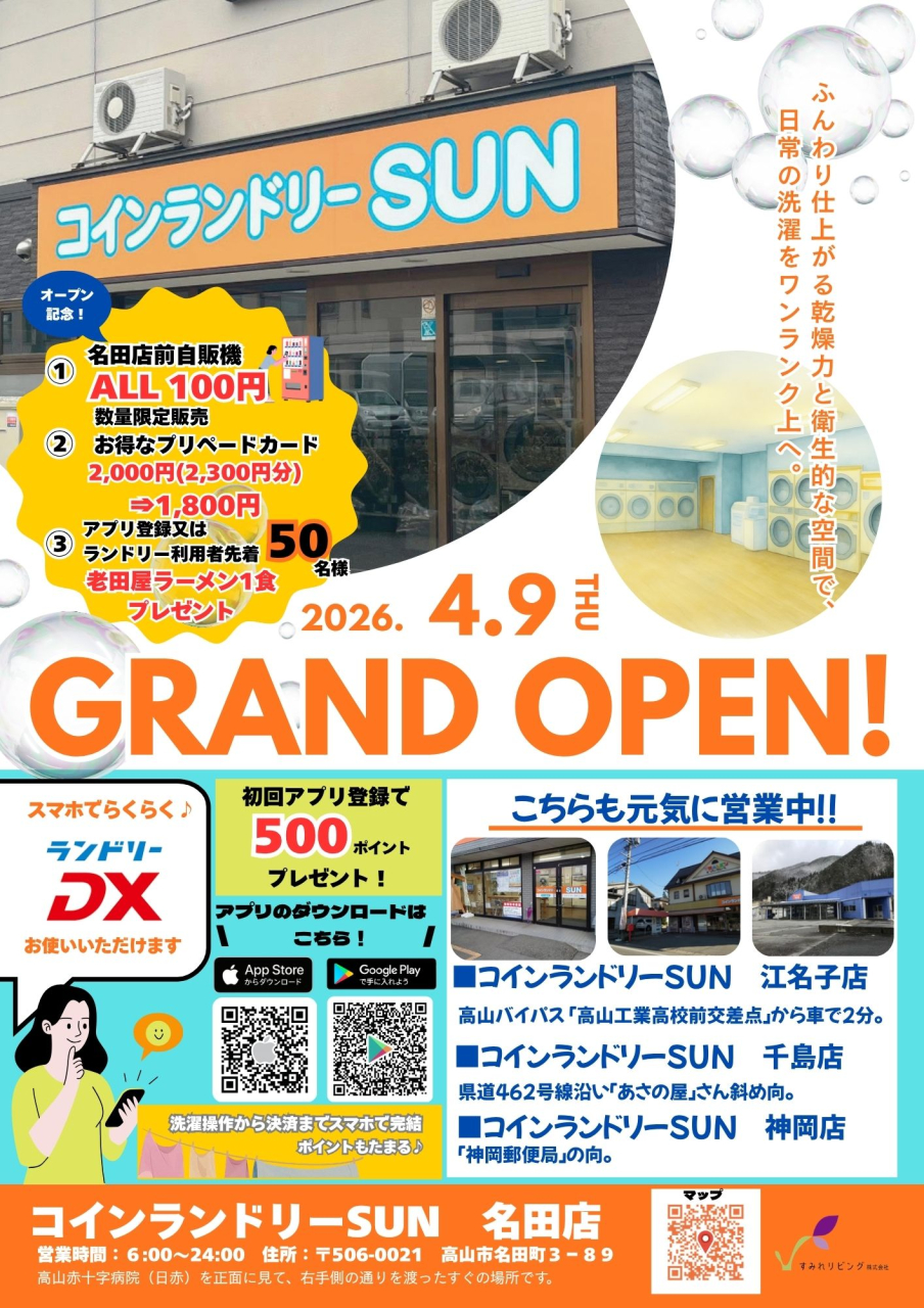 コインランドリーSUN 名田店が2026年4月9日(木曜日)にオープンいたします。
